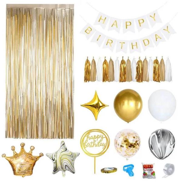 60 dažādu krāsu baloni; 1x vainaga formas balons; 2x piecu zvaigžņu baloni; 2x četru zvaigžņu baloni; 1x aizkars no mirdzošām lentītēm; 1x laimīgas dzimšanas dienas baneris; 5x krāsainu dekoratīvo pušķu komplekts; 1x laimīgas dzimšanas dienas tortes dekorācija; Dekoratīvā lente, balonu sasiešanas piederumi, līme un balonu stiprinājuma lente.