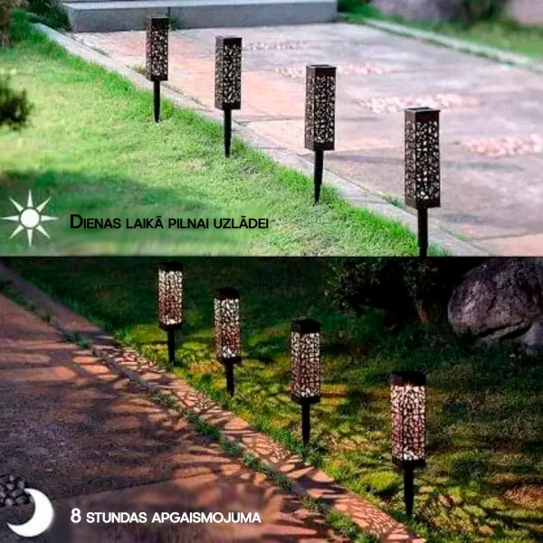 Saules lampa darbojas automātiski, dienas laikā uzlādējoties ar saules enerģiju, un naktī spīd vairāk nekā 8 stundas!