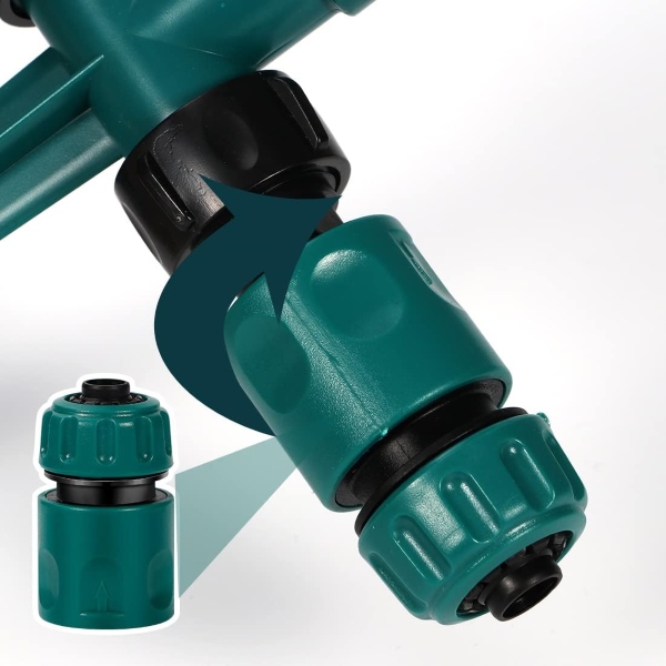 Izmantojot ROTOSPRITZ dubultos ūdens šļūtenes uzgaļus, varat bez piepūles savienot vairākus smidzinātājus, lai pārklātu lielākas platības. Vienkārši savienojiet divus vai vairākus ROTOSPRITZ aparātus kopā, lai nodrošinātu divpusēju apūdeņošanu, tādējādi nodrošinot, ka viss dārzs saņem perfektu ūdens daudzumu. Šī viengabalainā savienojamība ir ideāli piemērota plašiem zālieniem un plašām dārza dobēm.